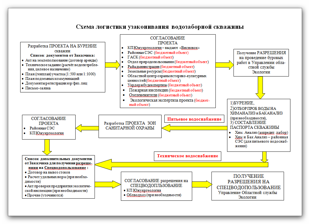 Проект должен быть согласован в санитарно-эпидемиологических и геологических службах. Чтобы начать бурение по проекту, требуется разрешение от органов.